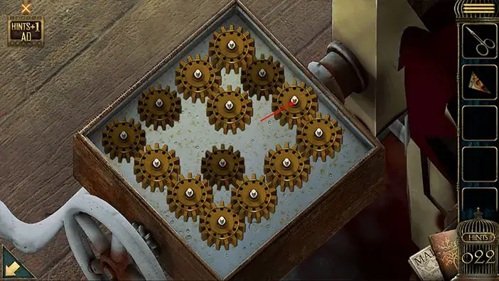 We can see that the gear on the right is missing. So, select the “Syringe” from the inventory and insert it into the empty slot.