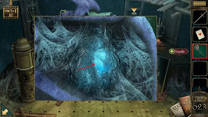 Select the “Needle” from the inventory and use it to pierce the blue wall in this chamber.