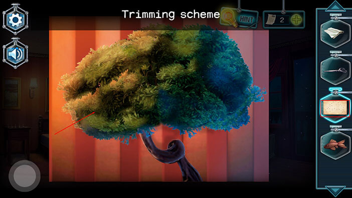 We can see the dots that represent the proper way to trim the tree. Select the “Elegant Scissors” from the inventory and tap on the trimming scheme to start the interaction.