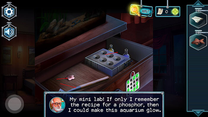 Tap on the two items in the drawer to pick them up. A “Medallion” and a “Small Rake” will be added to your inventory. Also, if we tap between the potions, we will find out that Jack can make the aquarium glow if he remembers the formula.