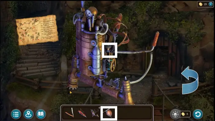 Return to the Mora’s workshop and use the drill on the door on the left. A new puzzle challenge will begin.
