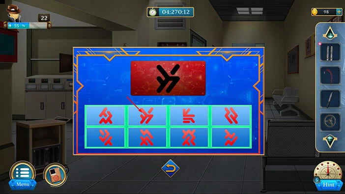 Here, we have another puzzle. If you pay attention to the symbols in front of you, you will notice that we already discovered these symbols when we deciphered the previous puzzle. So, our next task is to reorder and rotate the symbols to match the symbols on the hint.