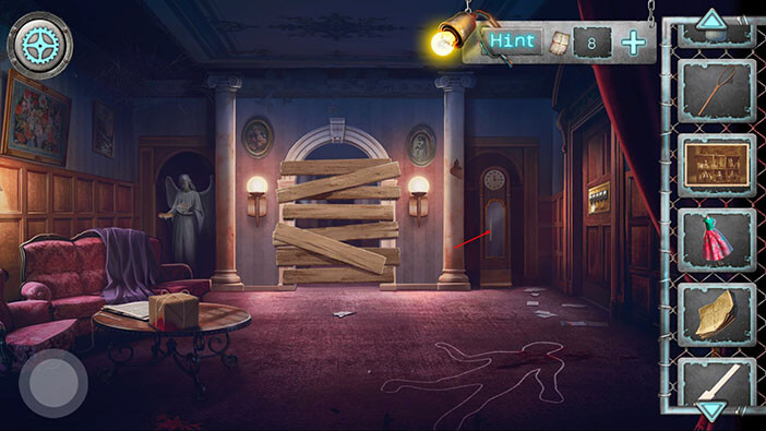 While we were in the hallway, we saw a carpet that was nailed to the floor. Since we found a crowbar, let’s go back to the hallway and use it to pull out the nails. Tap on the button in the lower-left corner to go back.