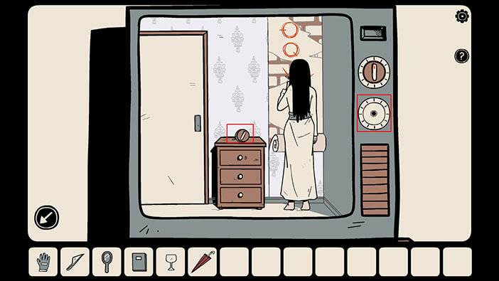 Ok, since the dial appeared on this cabinet, we know that the girl in the video was drawing on the wall to the right of it. So, select the “Makeshift Knife” from the inventory and tap on the wallpaper several times to remove it.