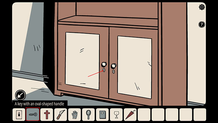 Tap on the drawer to the right of the front door to take a closer look at it. Select the “Key with the round handle” (we found it inside the broken bottle) from the inventory and tap one keyhole on the top drawer to unlock it.